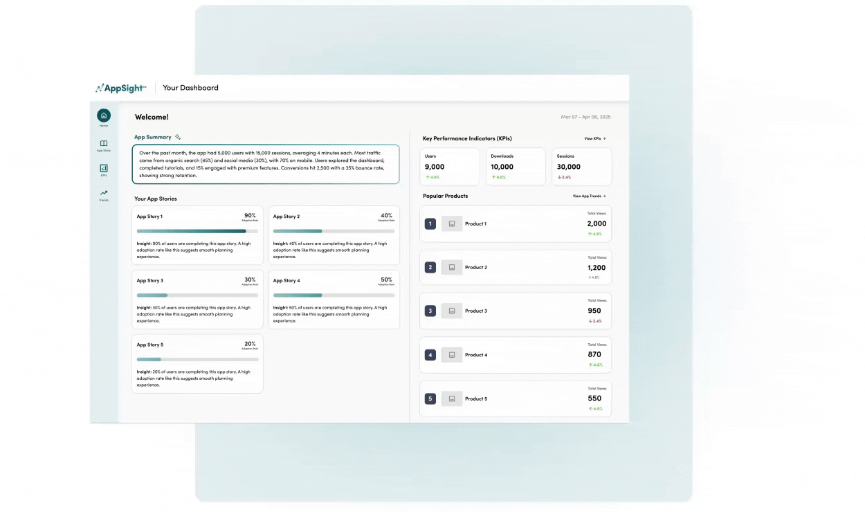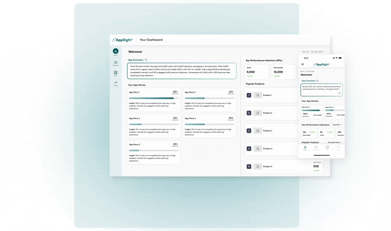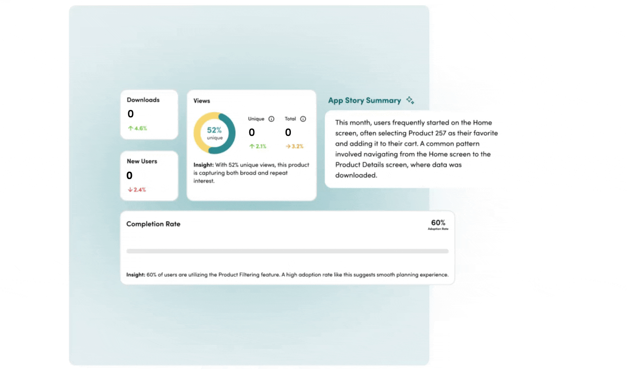 Using AI-driven insights, we generate a personalized dashboard that breaks down user behavior for each app story, highlights the unique qualities of your users, and surfaces opportunities to improve the user experience.